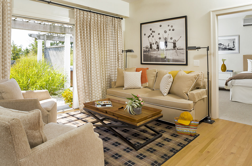 The Cape Pogue Cottage blends views of the beautiful landscape at the Winnetu, including oceanside beaches and poolside charm with a mixture of calming decor for a relaxing vacation space.