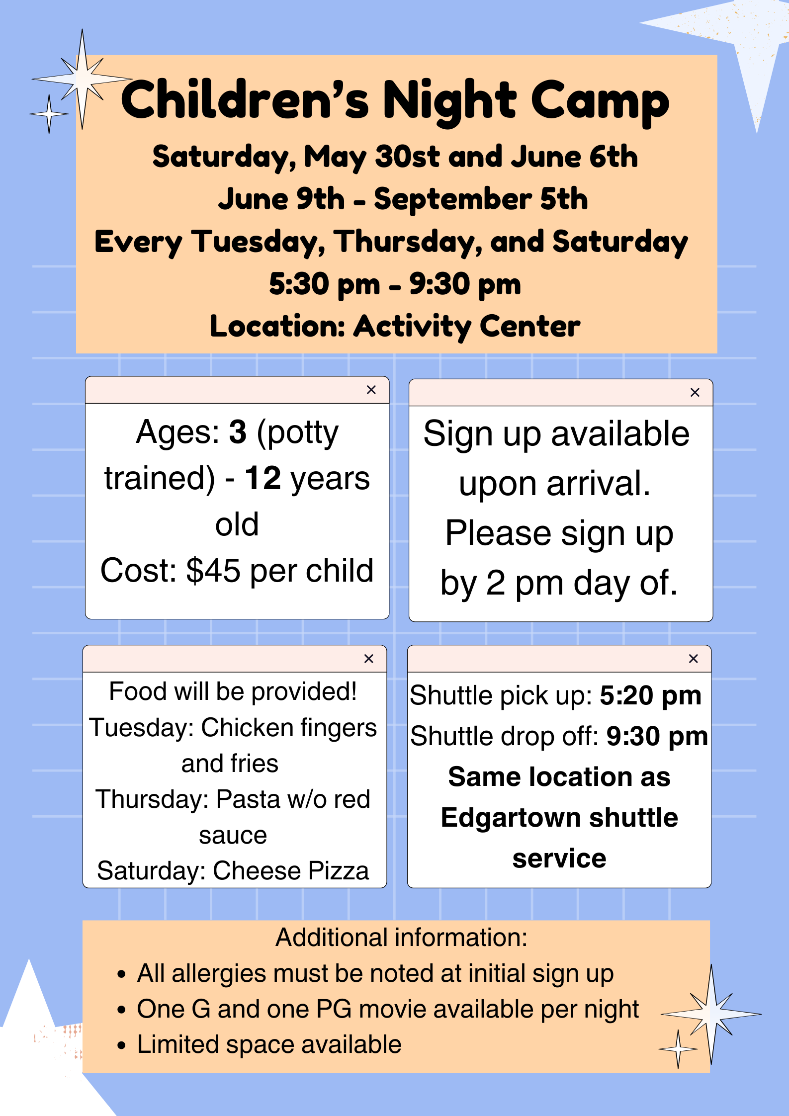 Give yourself a guilt-free night out and we’ll take care of the kids! Our Children’s Evening program offers them a chance to make friends, eat dinner, play outdoor games, and watch a movie while you enjoy a little time to yourselves! Offered for children ages 3 (potty-trained) – 12. Sign up takes place onsite.