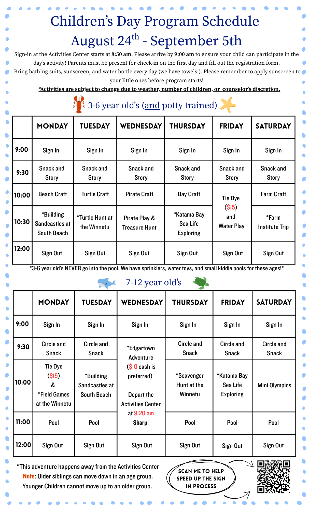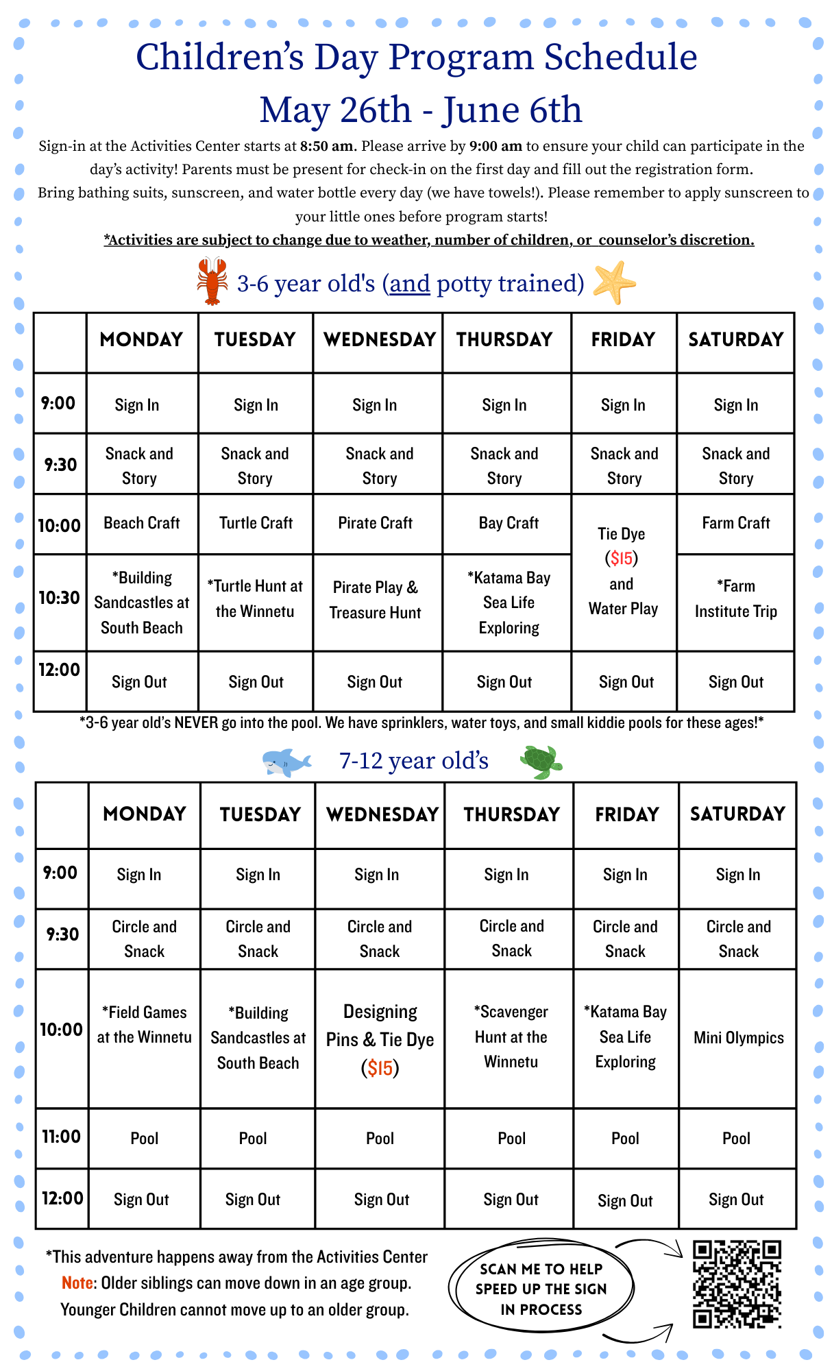 Sign-in at the Activities Center starting at 9:00 AM. Parents must be present for check-in on the first day and fill out the registration form.
